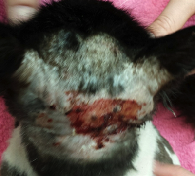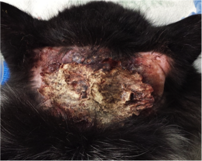 When Sylvester arrived at the clinic he had a very large wound encompassing the whole back of his head!
